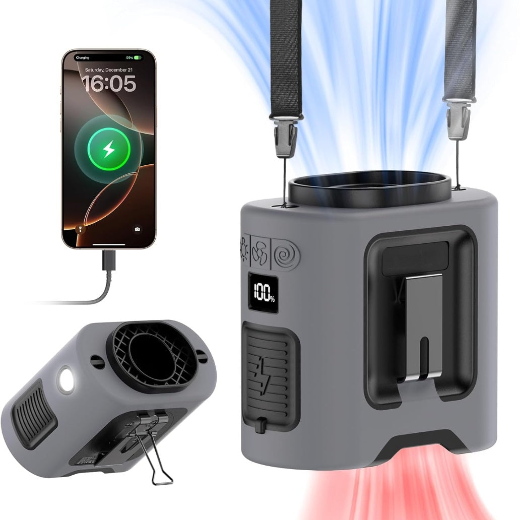 This portable waist clip fan features a built-in 10,000mAh rechargeable battery.